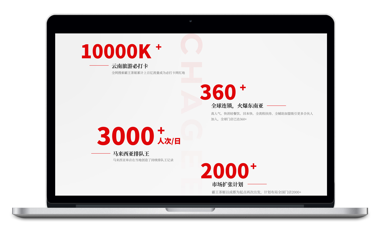 人們對(duì)于數(shù)字的敏感度遠(yuǎn)高于其他文字和圖片,根據(jù)霸王別姬品牌的發(fā)展歷程,在這一塊的處理方式上,我們整理了品牌的一些關(guān)鍵數(shù)據(jù),采用階梯式的左右布局輔以簡(jiǎn)要文字說(shuō)明,這些都是霸王茶姬品牌發(fā)展至今成果沉淀。